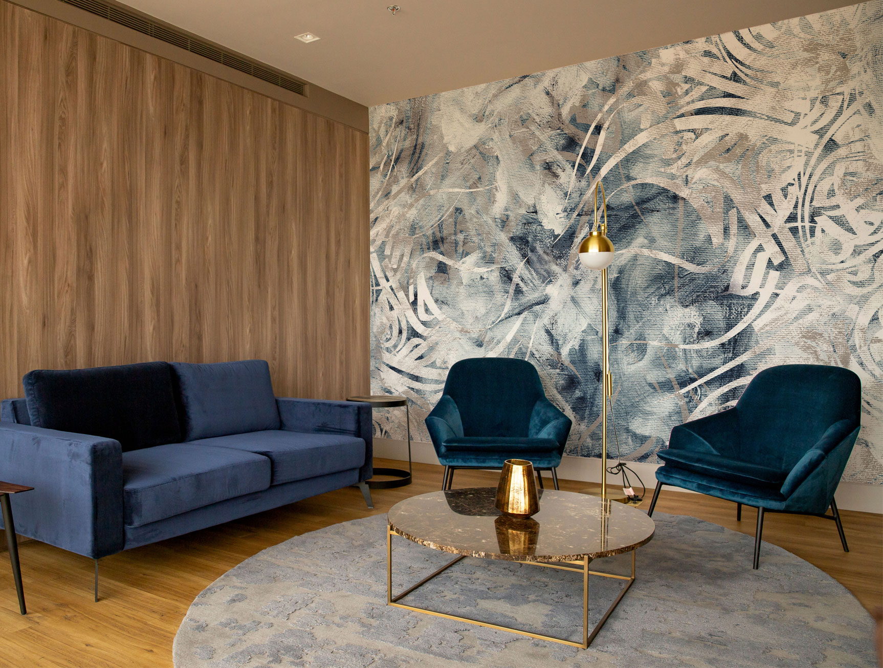 Transform your modern space with our artistic wallpaper featuring Arabic typography and elegant brushstroke details. With blue and brown tones, it adds a contemporary, artistic flair perfect for spaces that appreciate Arabic design.