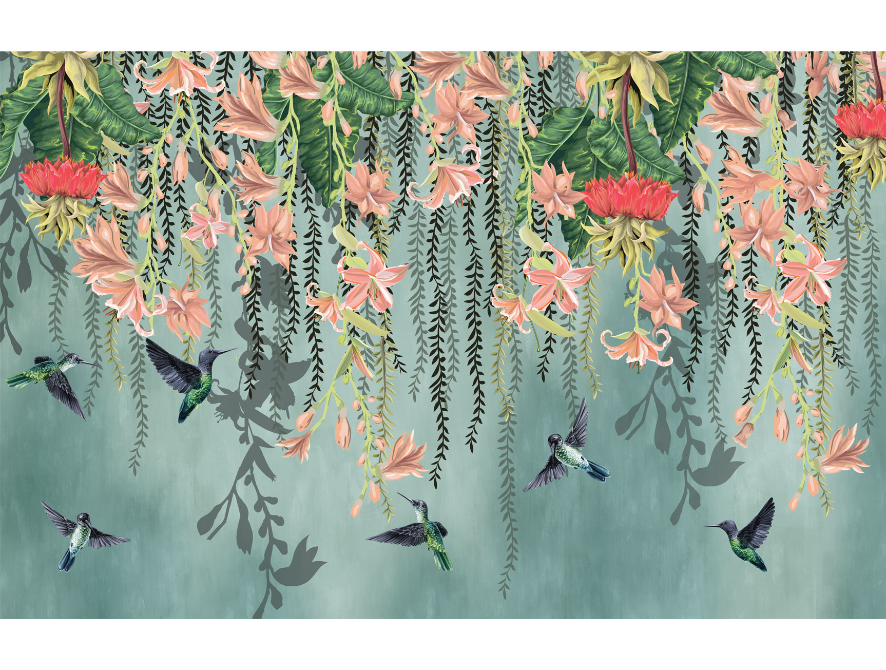 Bring the beauty of nature indoors with our soft blue wallpaper featuring hanging flowers, leaves, and flying birds. Its delicate and calming design is perfect for spaces that embrace nature-inspired elements and bring serenity to any room.