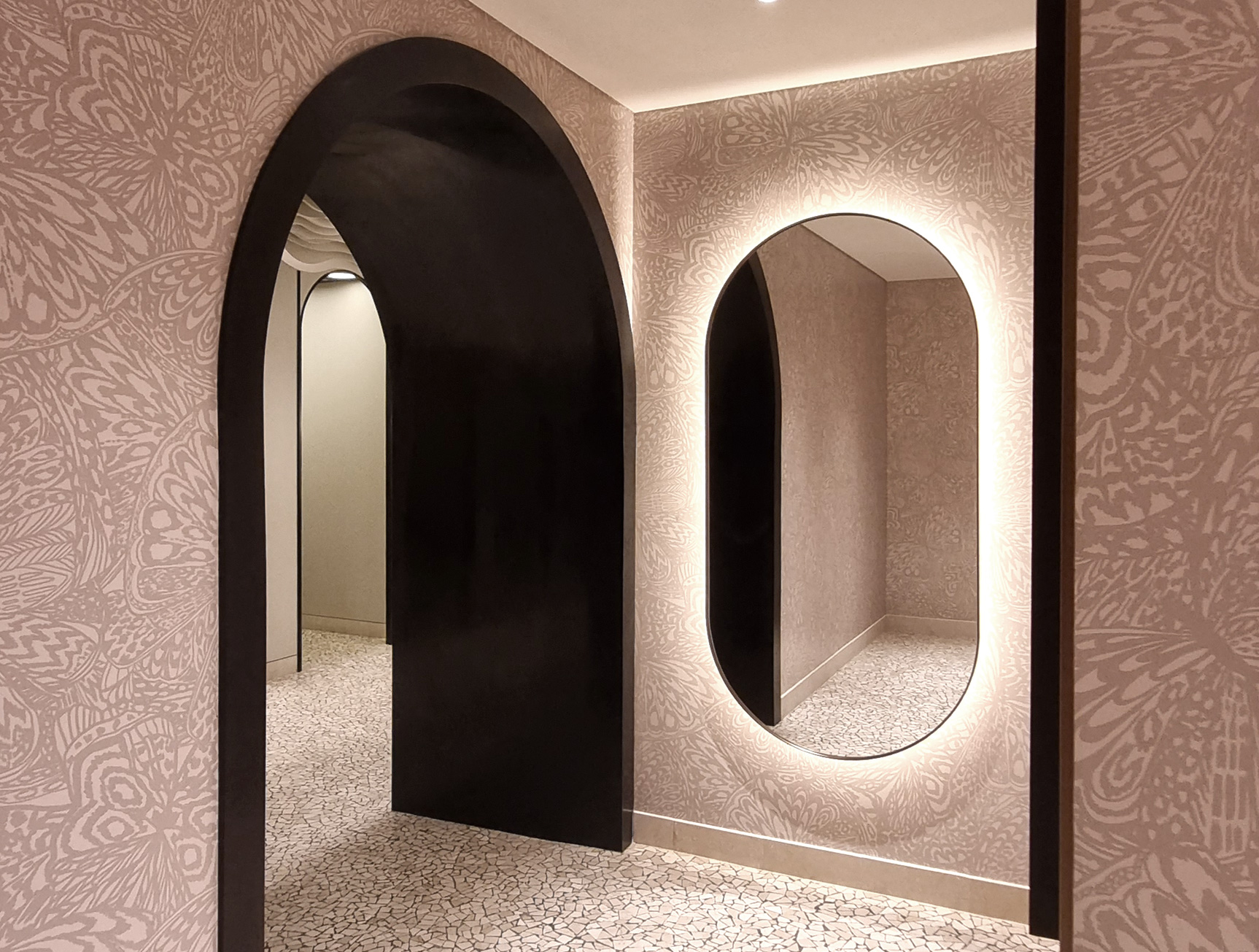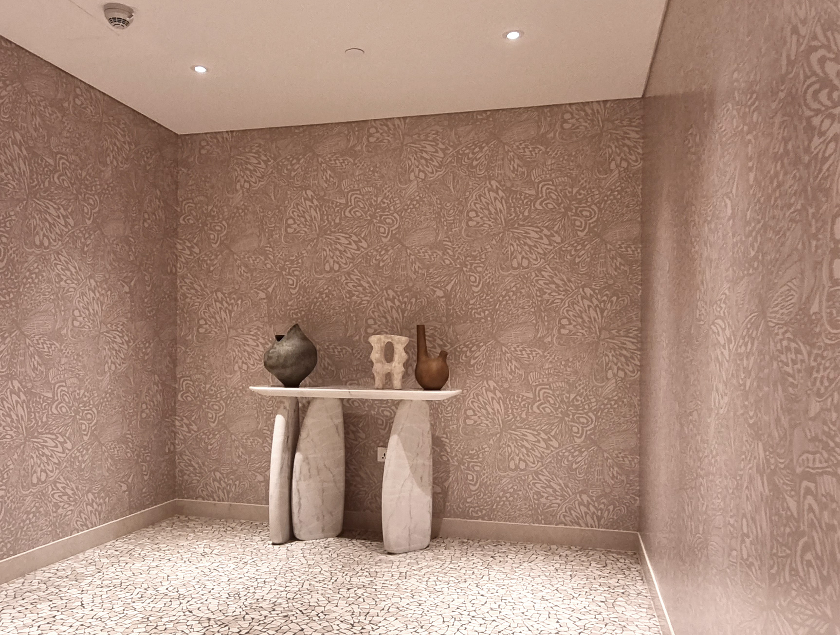 Discover our elegant nude butterfly pattern wallpaper, perfect for corridors and versatile interior decor. Featuring a repeating pattern, this design has been used in Dubai Mall corridors for a touch of sophistication.