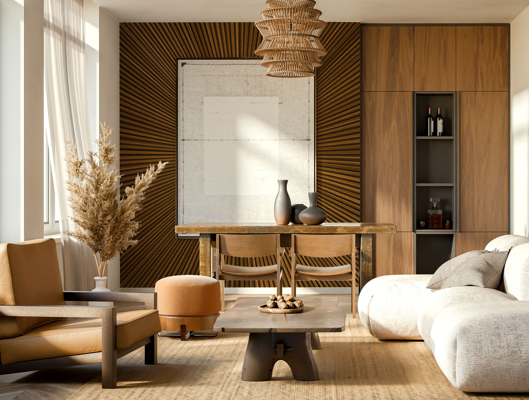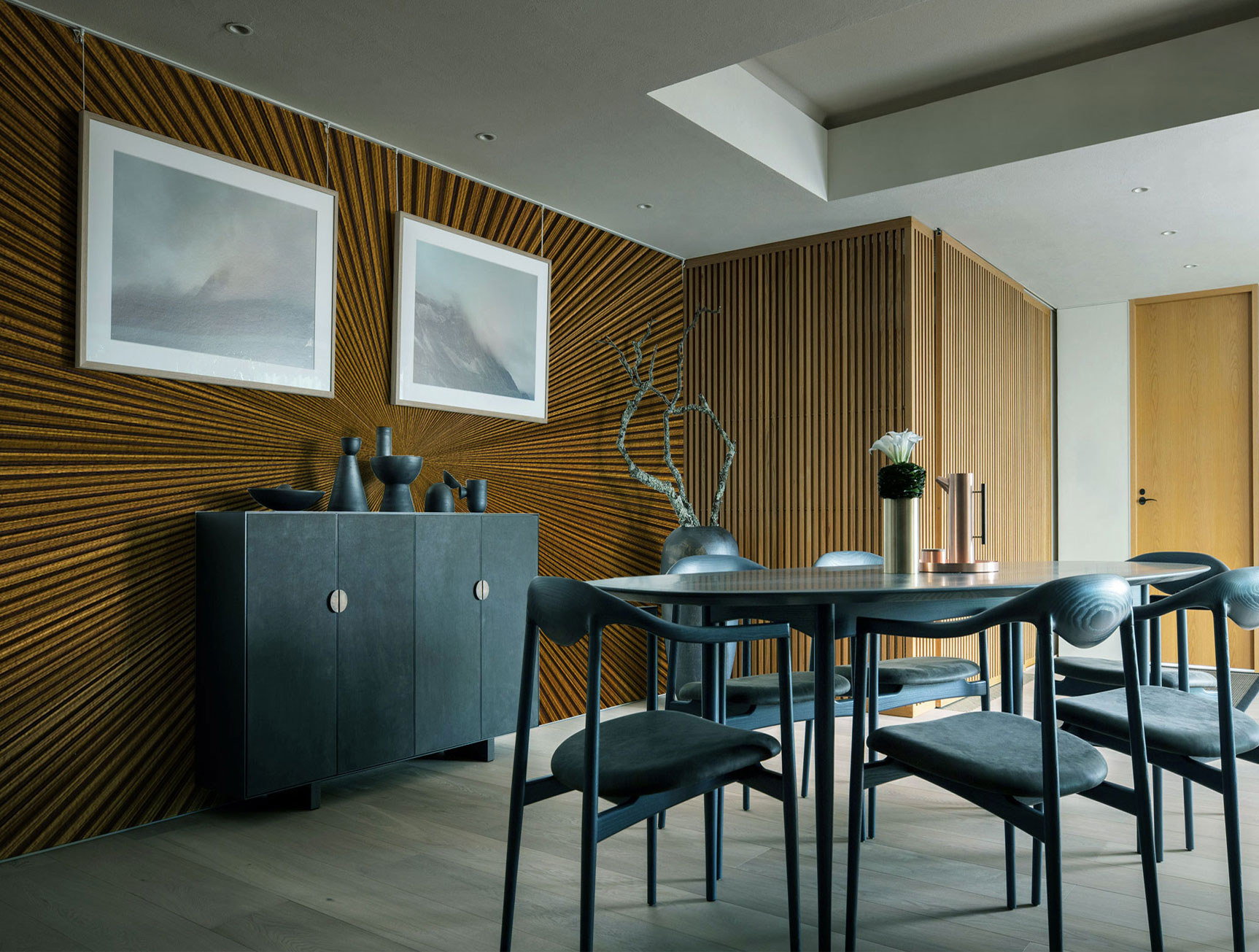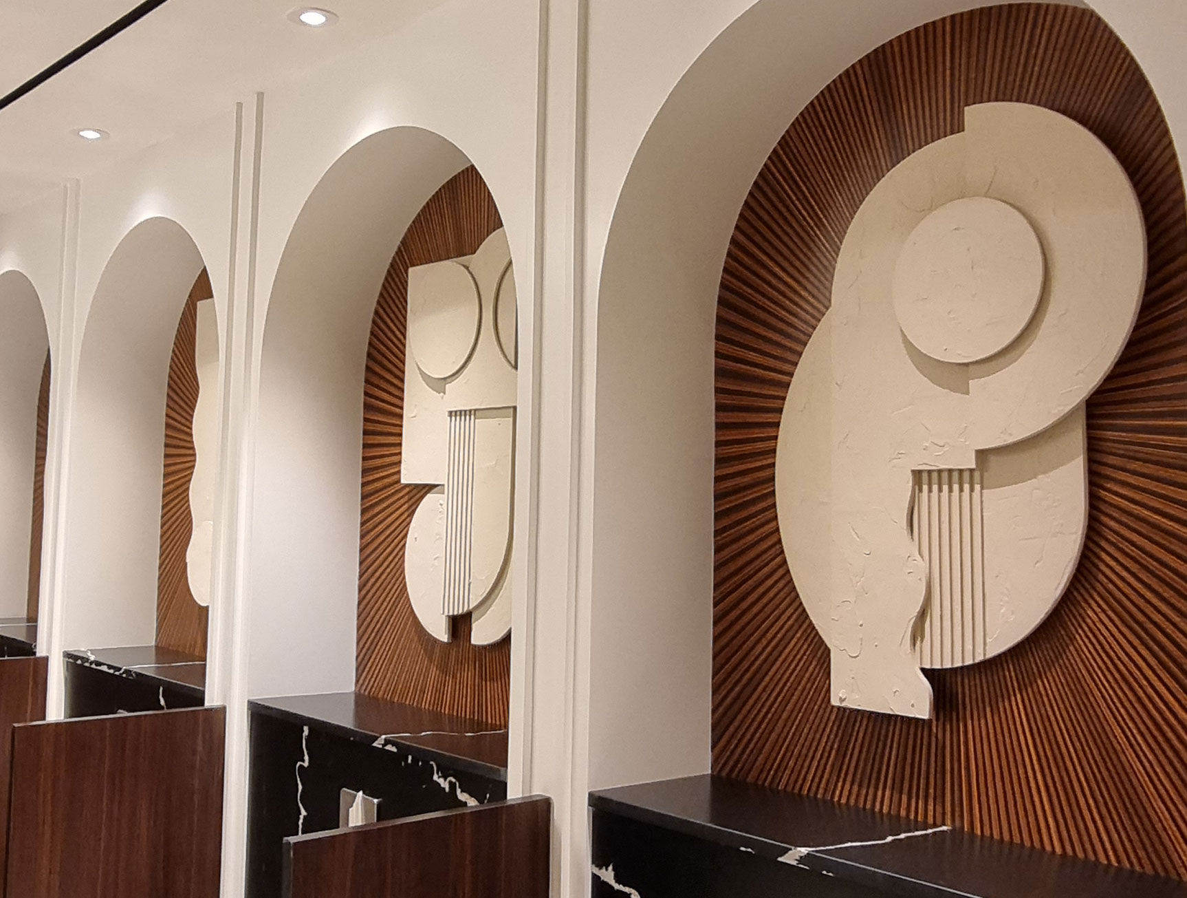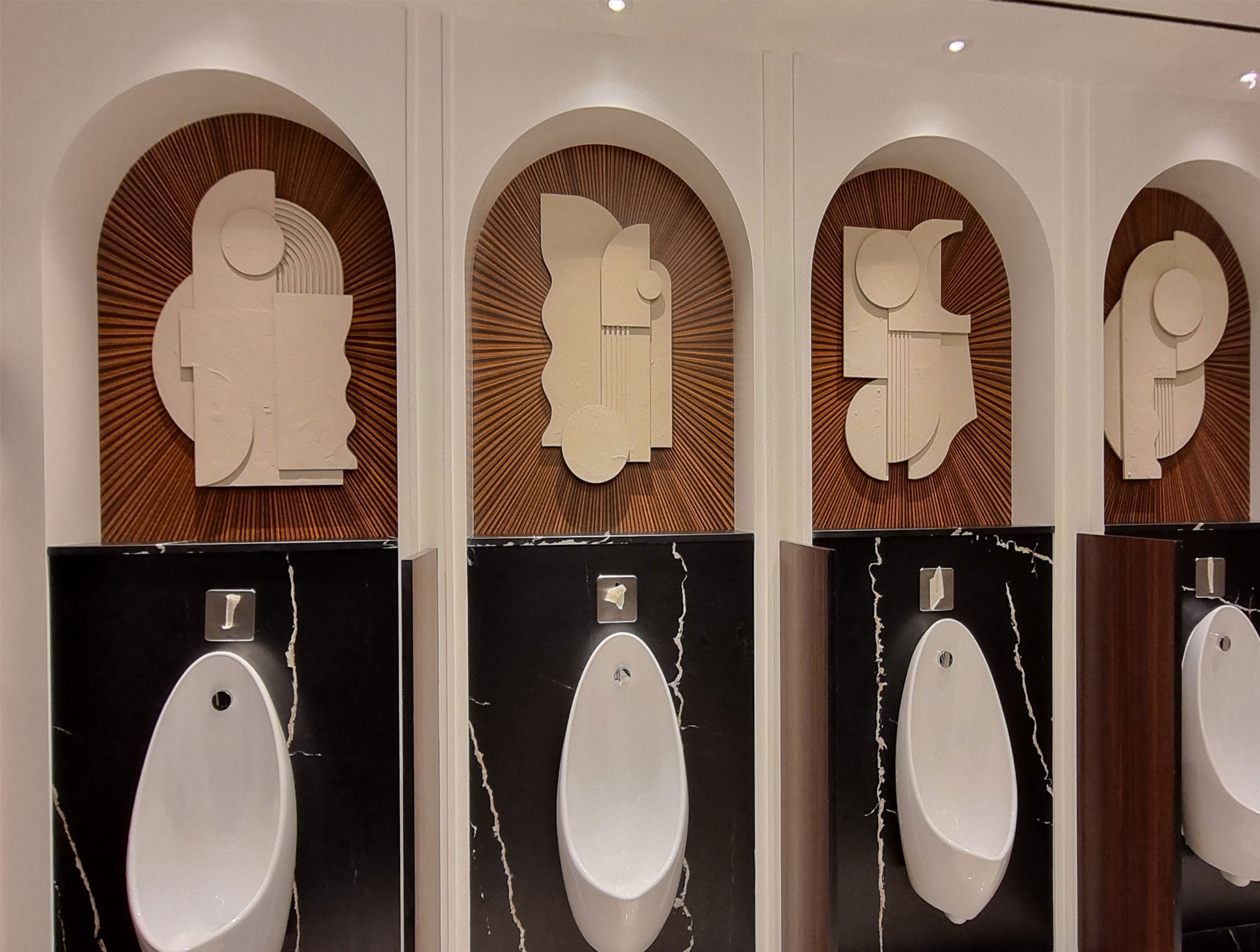 This artwork features wood textures with lines converging towards the center, creating a sense of depth. Ideal for special spaces, this design has been used in the washrooms of Dubai Mall, adding a unique touch to the environment.