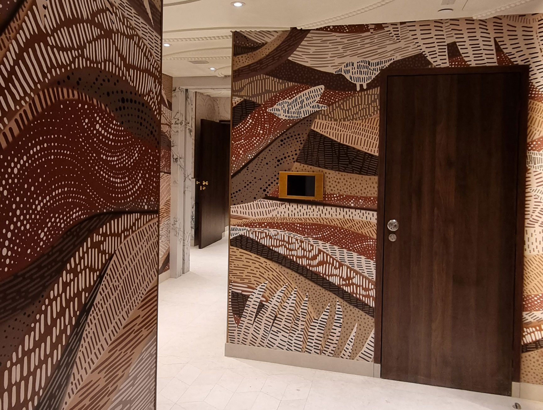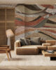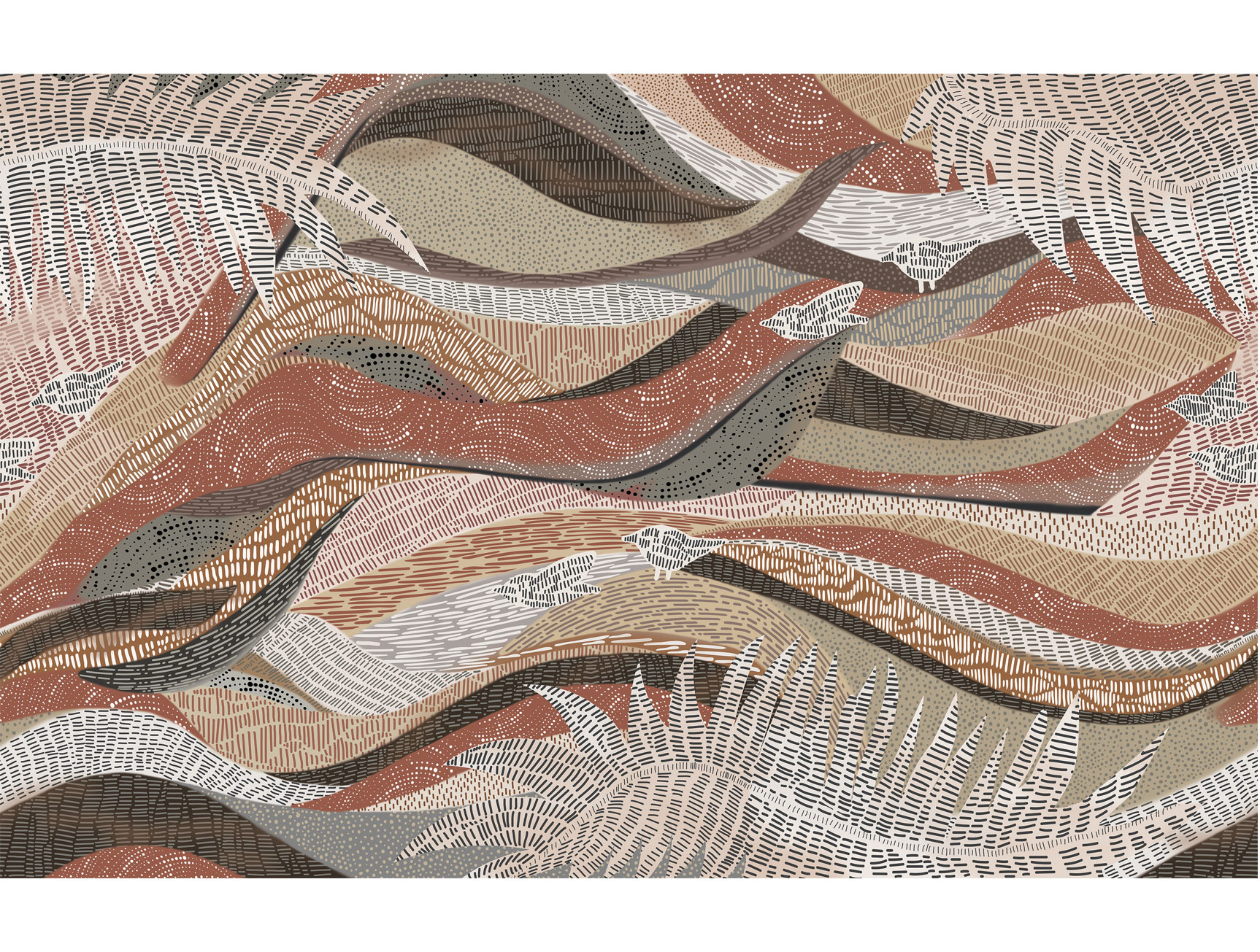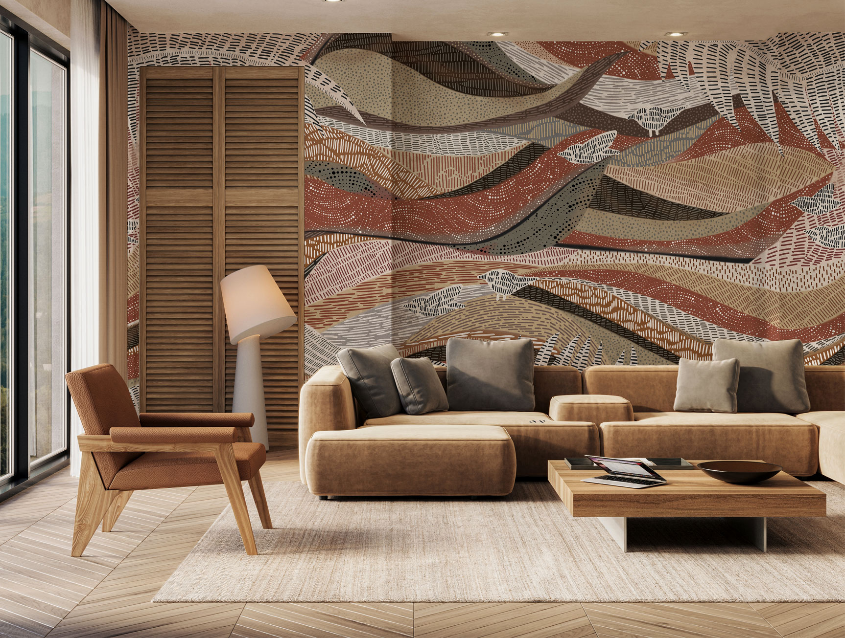Experience the beauty of desert landscapes with our abstract wallpaper featuring curves, lines, and dots. Perfect for modern spaces, it adds a warm and inviting atmosphere. Ideal for contemporary interiors.