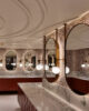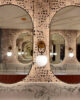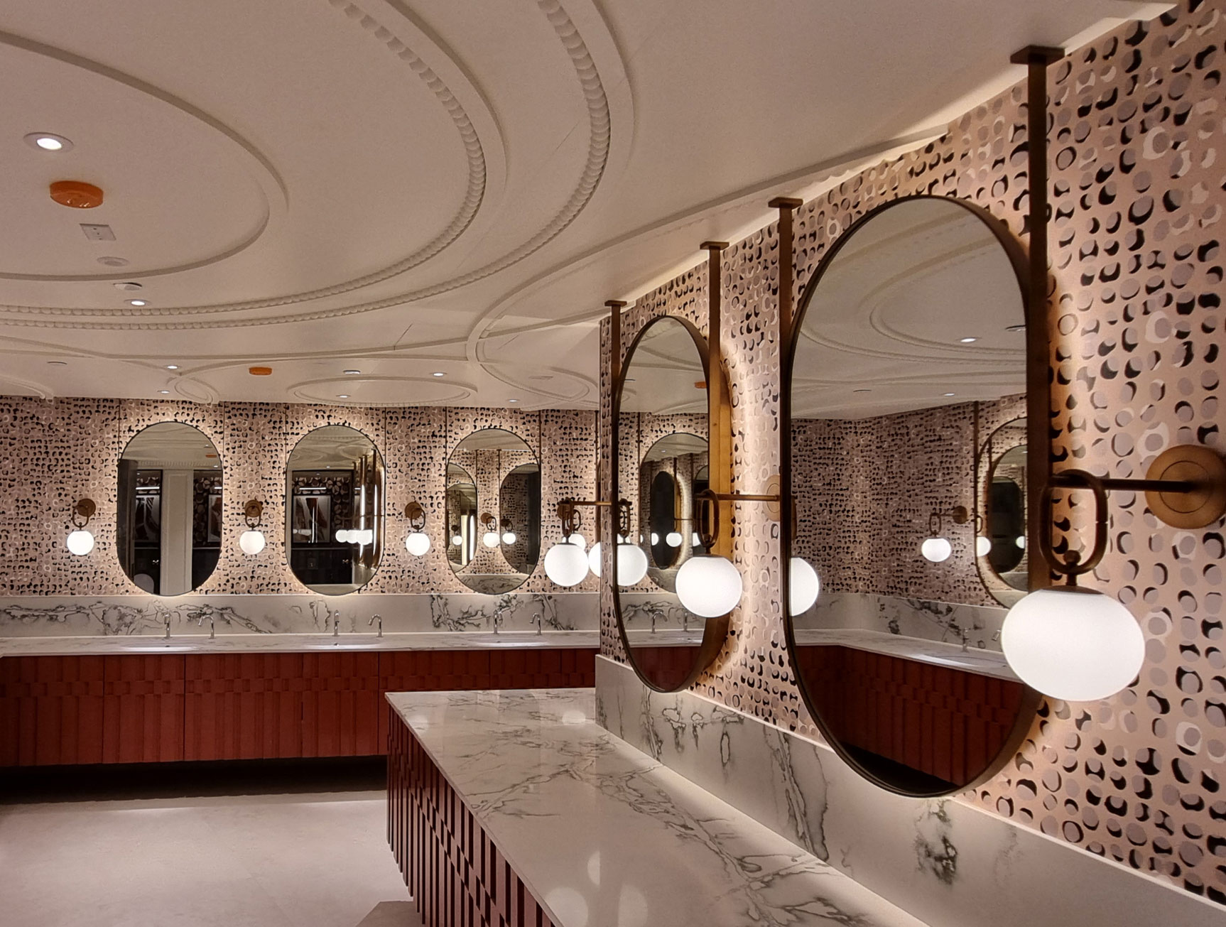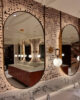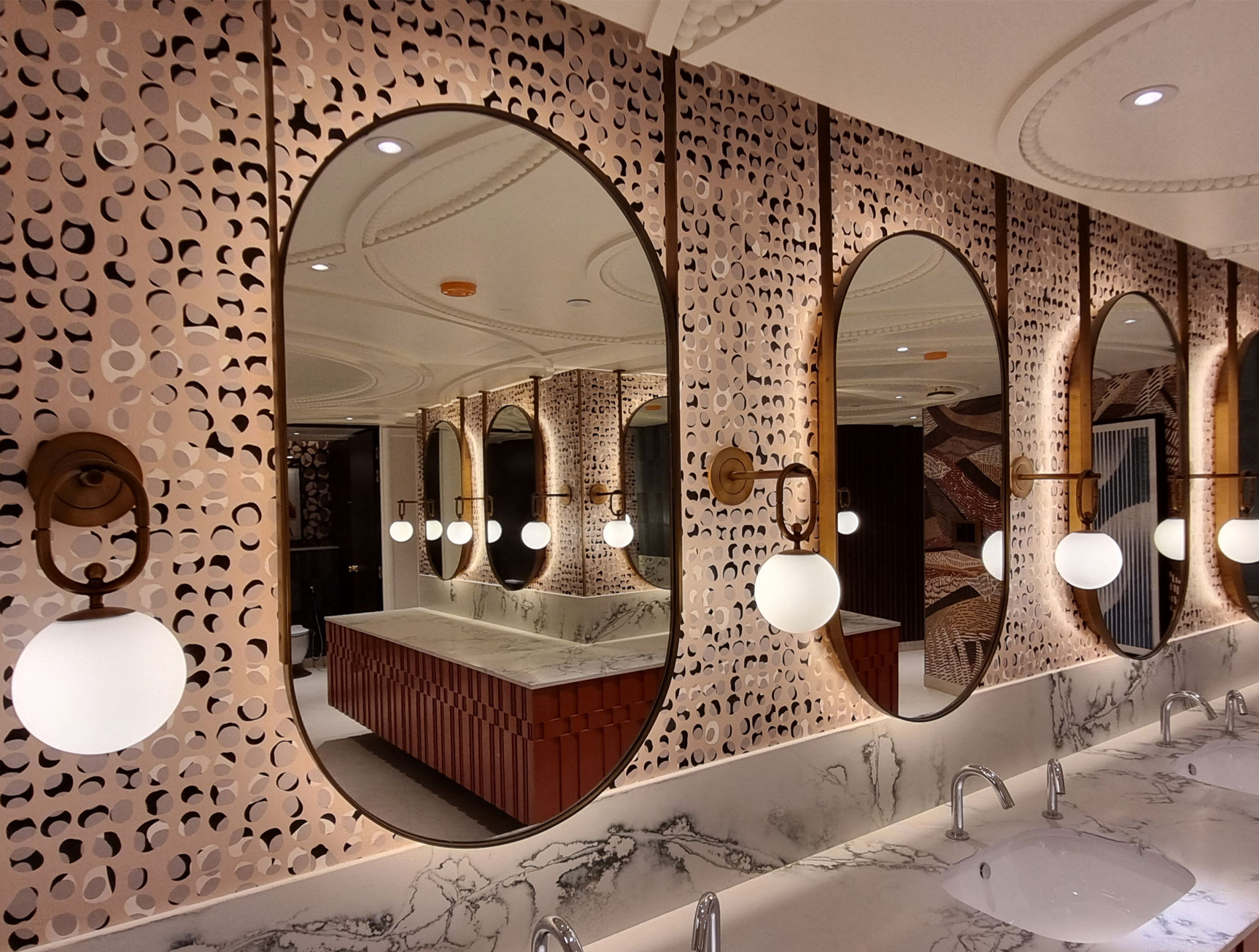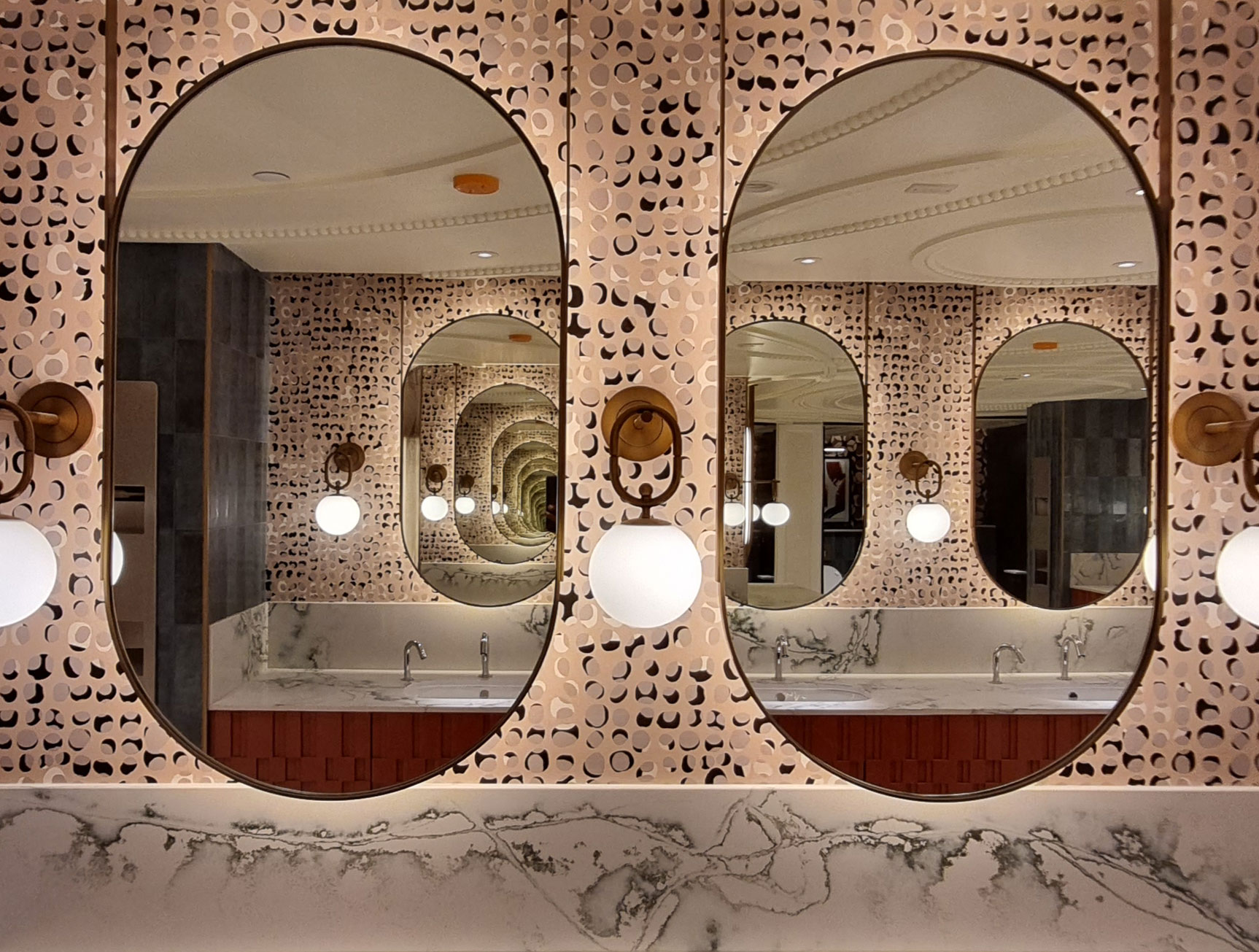 Discover the elegance of our geometric wallpaper with intricate dots and circles in grey and beige tones. Its unique design and color complexity make it ideal for commercial spaces, including applications at Dubai Mall.