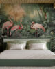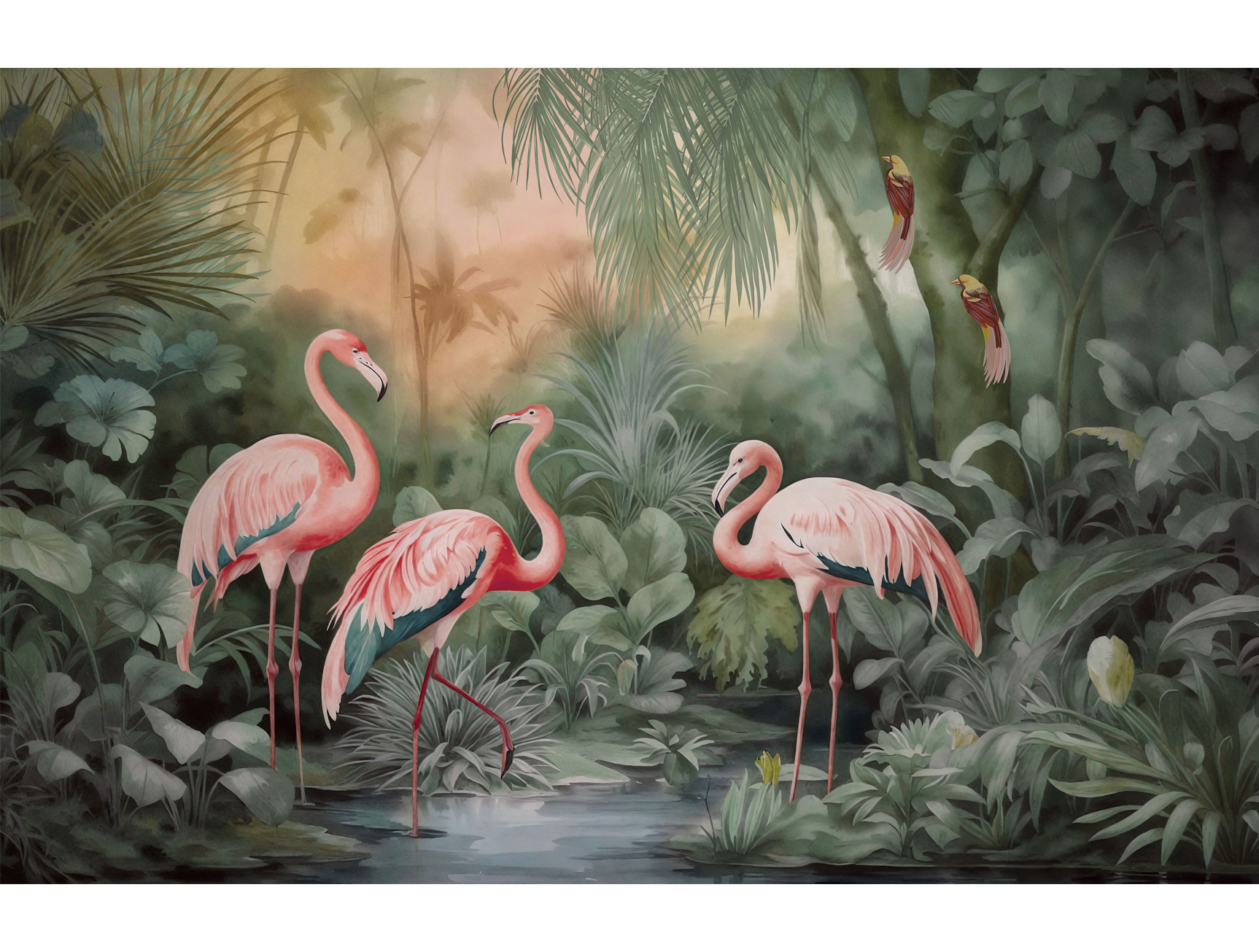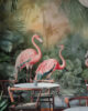 Discover a serene jungle scene featuring elegant flamingos and a soft watercolor palette. Perfect for creating a peaceful and artistic interior space.