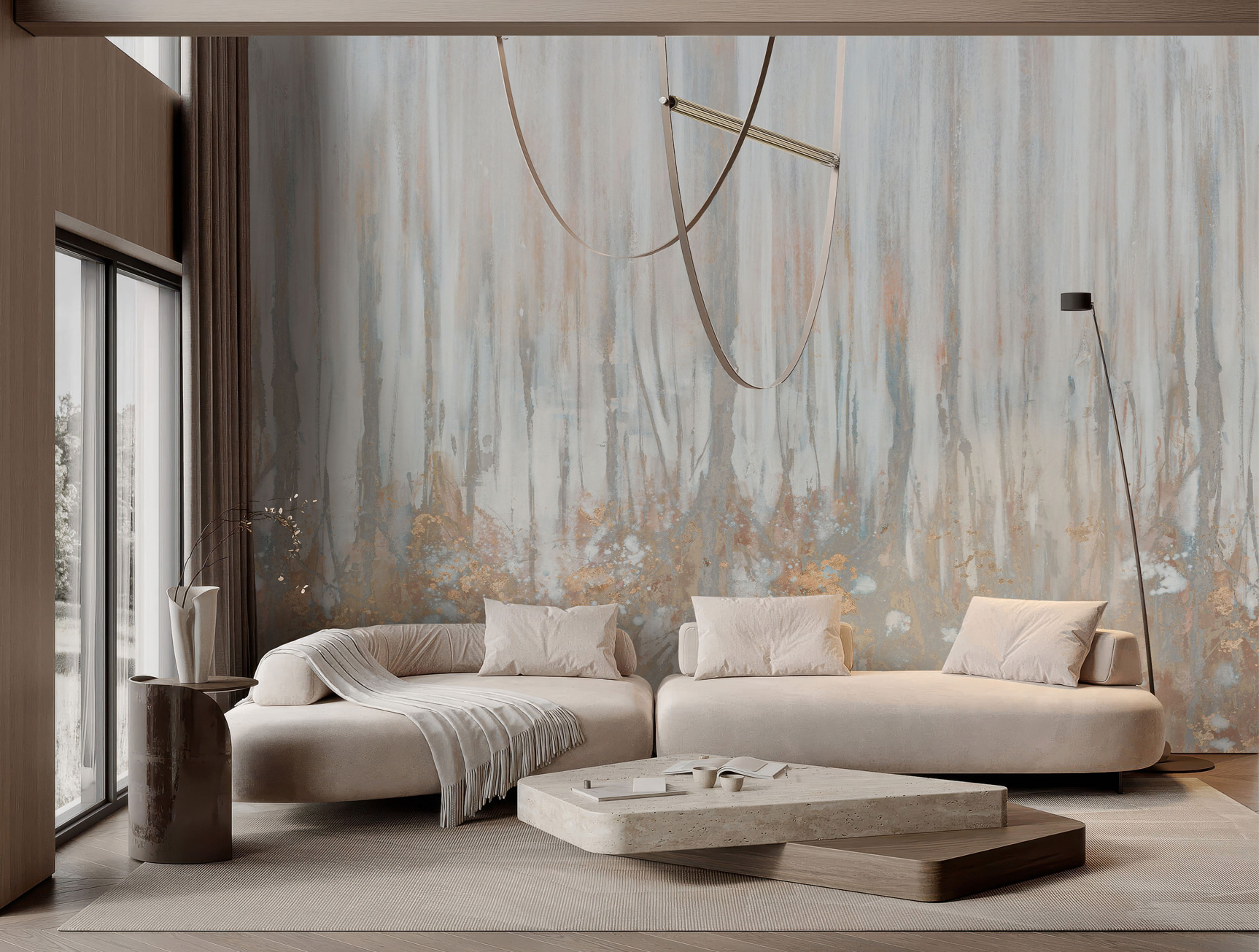Abstract wall art with grey, ash, and white tones accented with copper highlights for luxurious interiors.