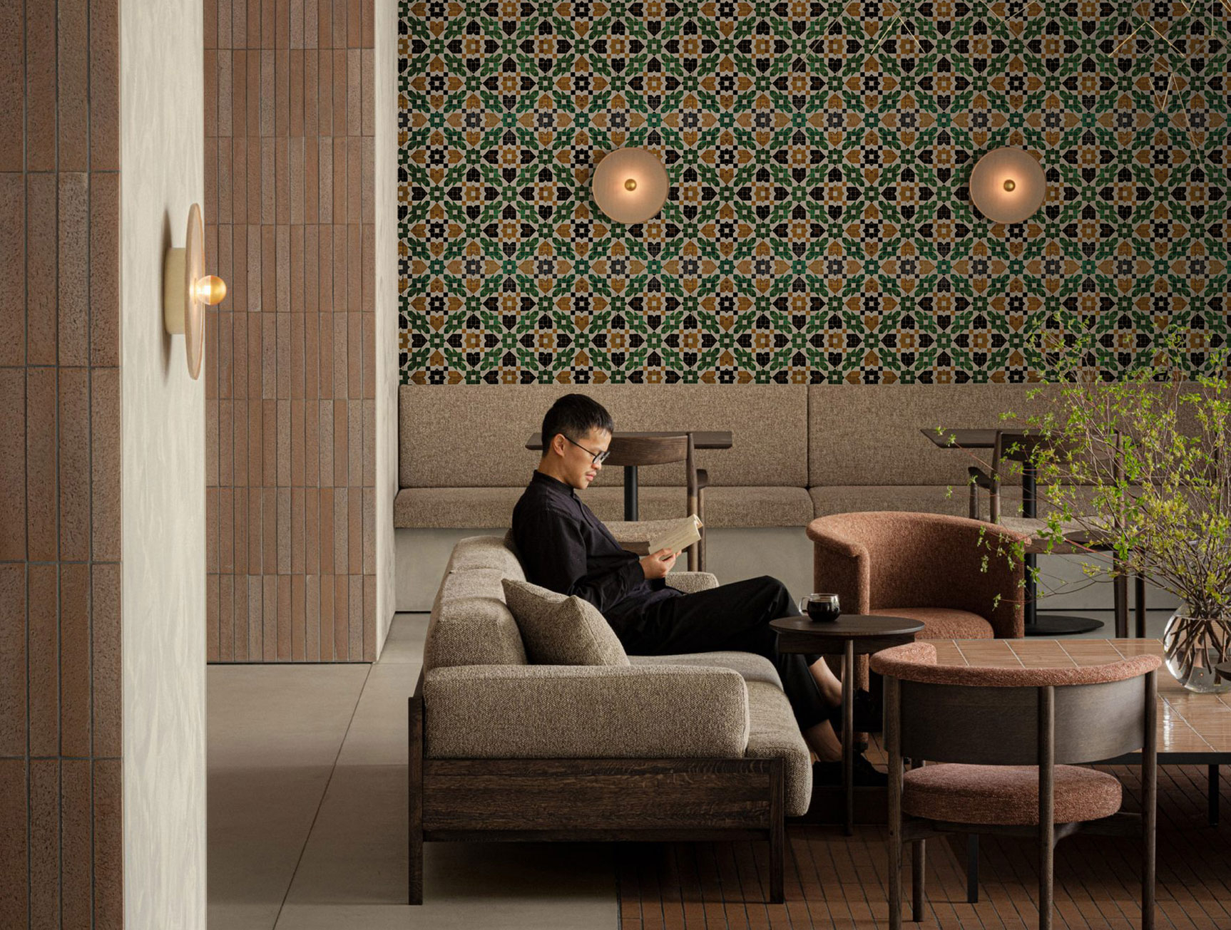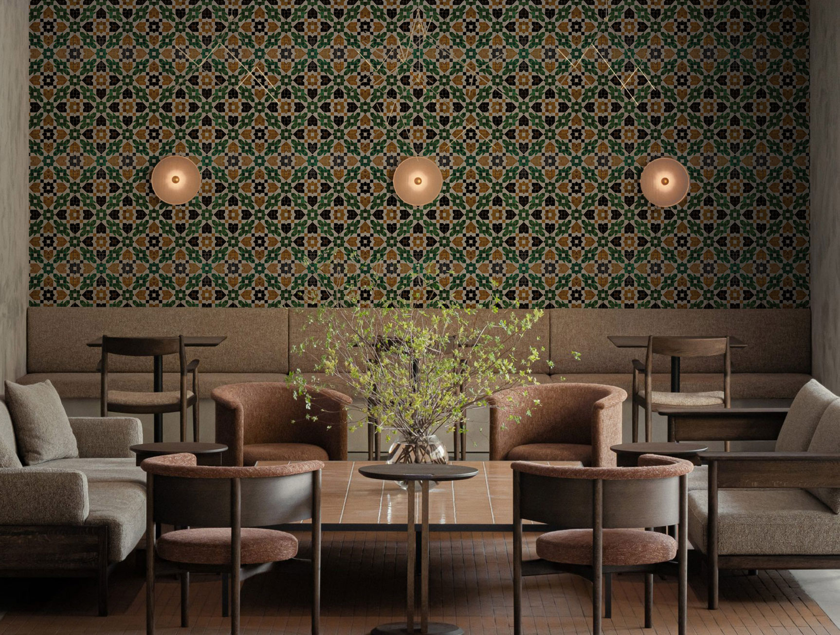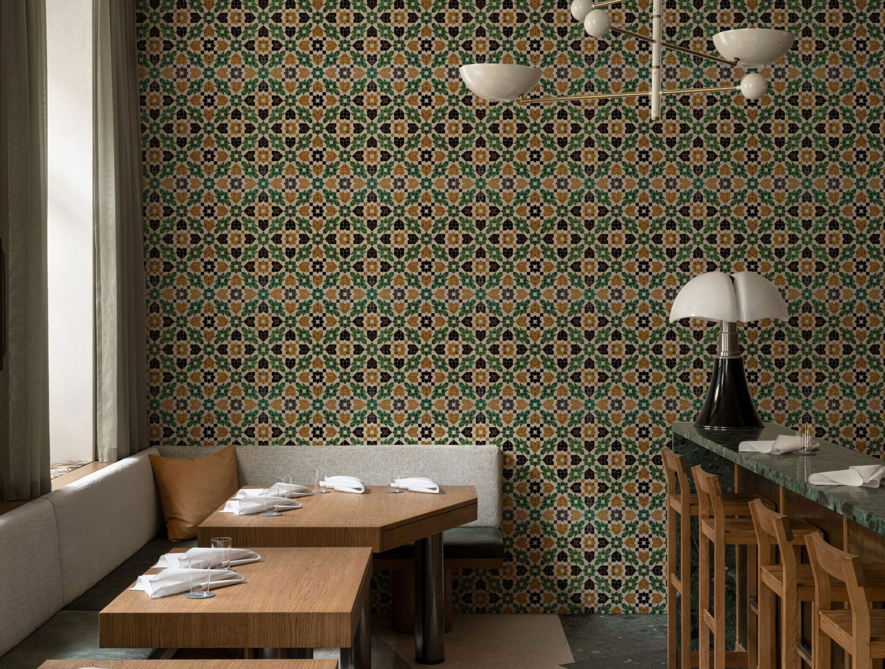 Transform your space with our traditional-inspired wallpaper, featuring intricate mosaic patterns in soothing beige and green tones. Ideal for cafes, restaurants, and spaces with a traditional touch.