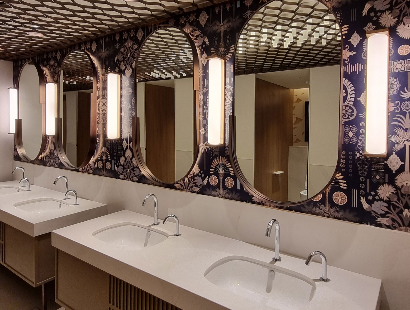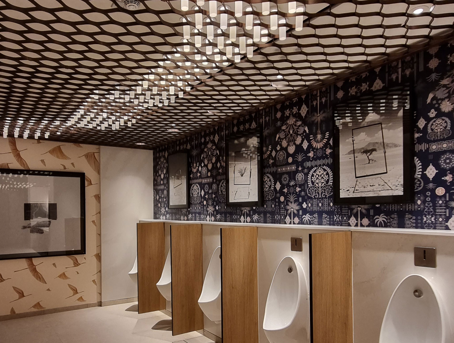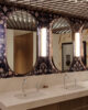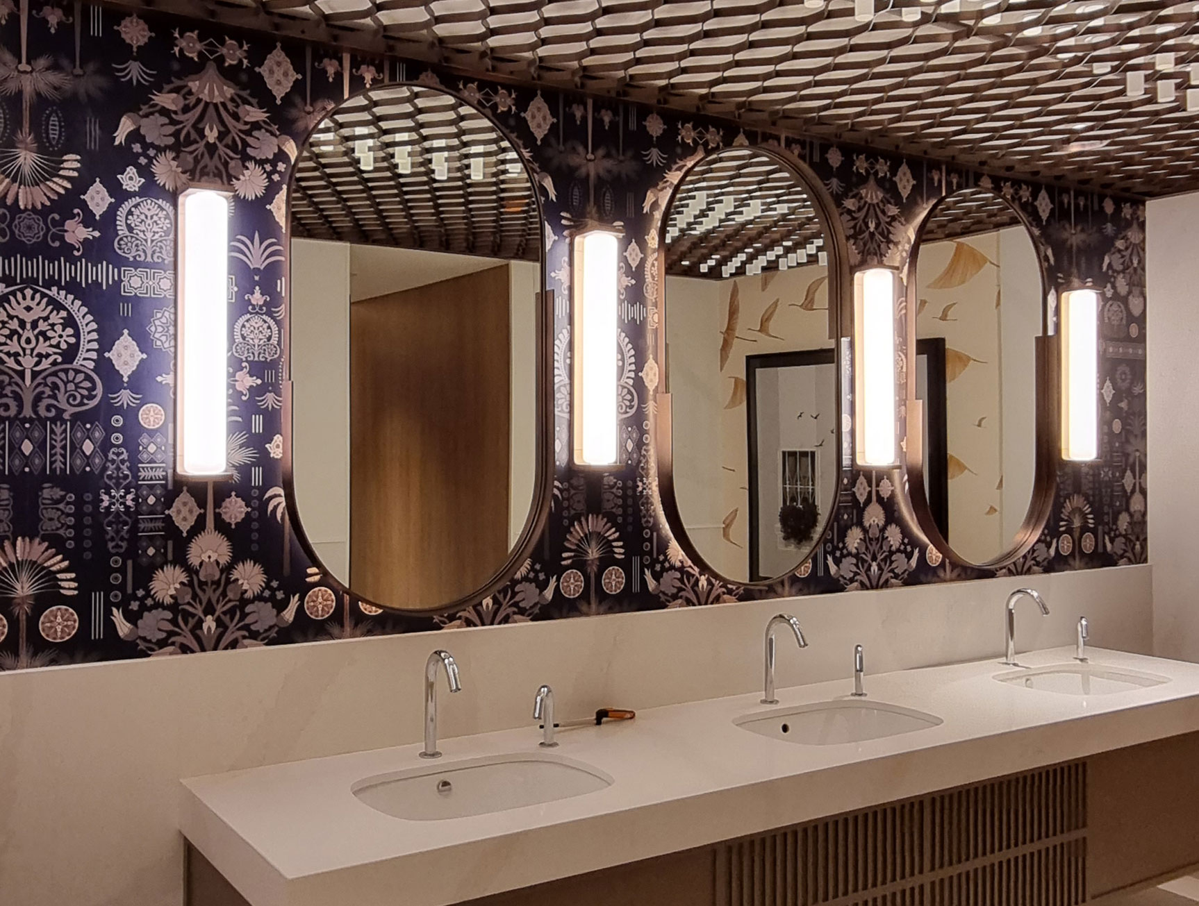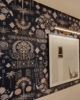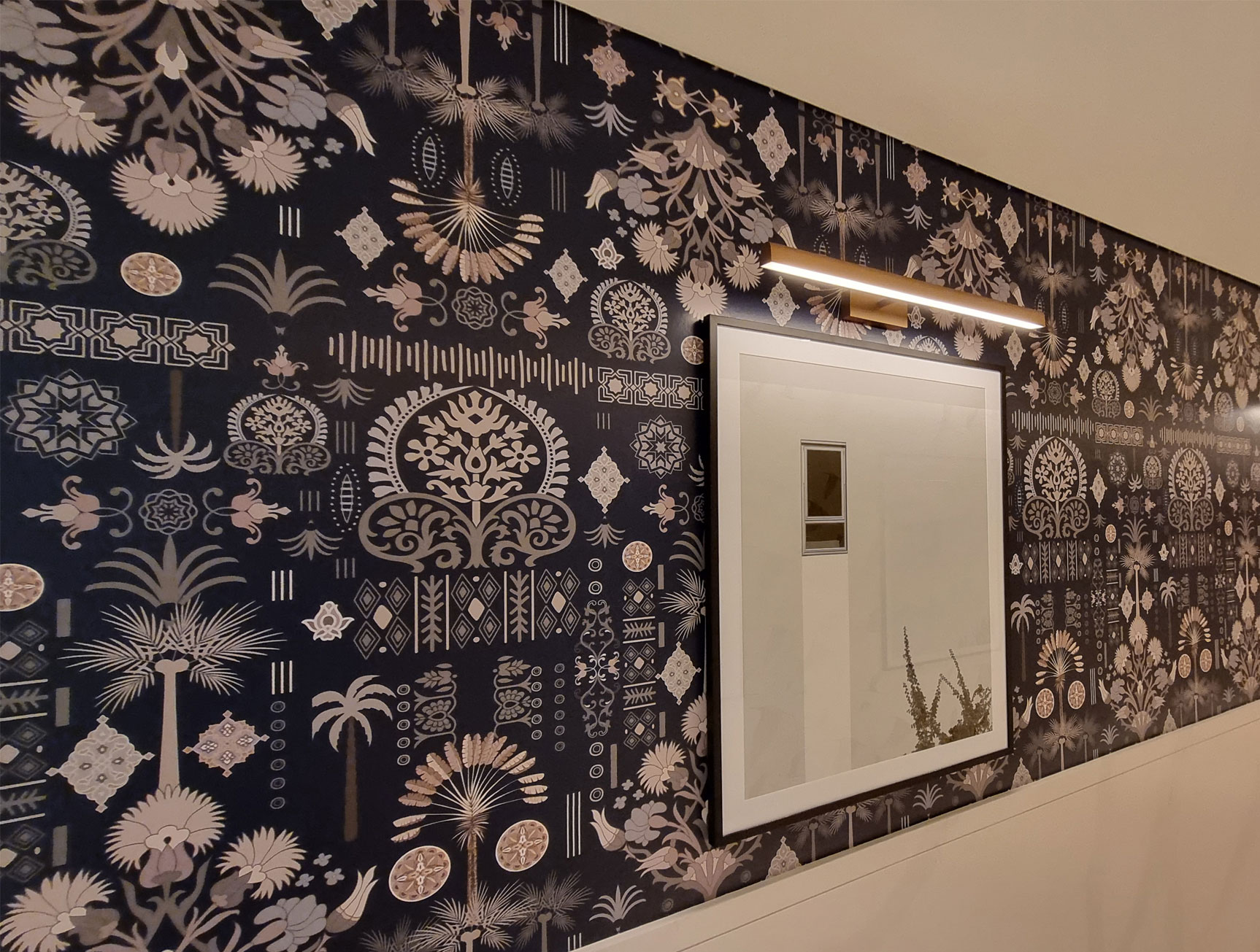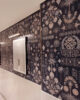 corridor Elegant Arabic Patterned Wallpaper in Navy and Silver Discover our elegant wallpaper featuring a blend of traditional and modern motifs in navy, silver, and gray. Perfect for adding a touch of Arabic and Eastern charm to any interior space.